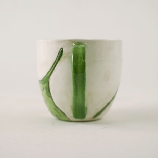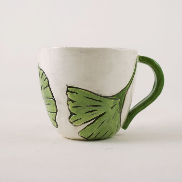 This mug was hand thrown and illustrated with ginkgo leaves. After bisque, the piece was then inlaid with color. This