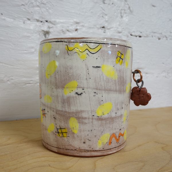 1 Charmed Whiskey Cup, Glaze Fired Earthenware, 2021, 3” x 3”. Pair one of these fun sippers with a fancy nip of Bourbon or Whiskey and you have the perfect holiday gift! This cup holds 6 fluid ounces and a couple of cubes.
