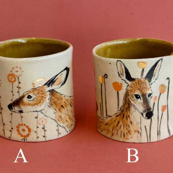 Delicate stoneware cups illustrated with White-tailed deer does. On each cup is clear glaze on the exterior, an olive caramel