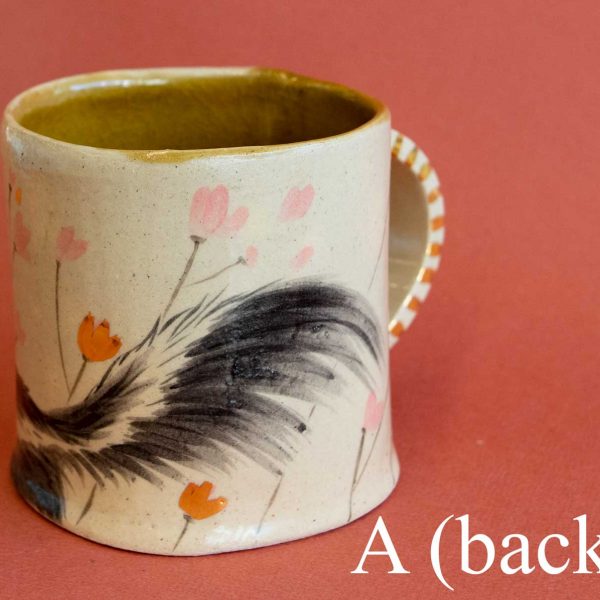 Coffee Mug, 3″x4″x4″, holds 13 ounces, mid-range earthenware with white slip and colored underglazes. Microwave and dishwasher safe.