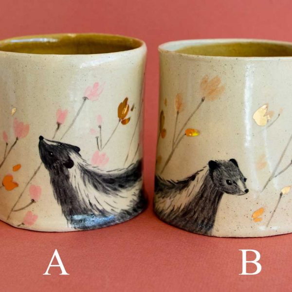 Delicate stoneware cups illustrated with lovely skunks. On each cup is clear glaze on the exterior, an olive caramel glaze