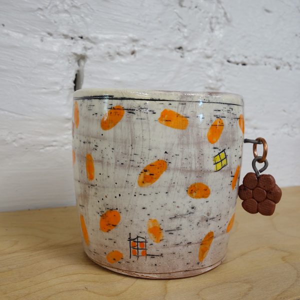 1 Charmed Whiskey Cup, Glaze Fired Earthenware, 2021, 3” x 3”. Pair one of these fun sippers with a fancy nip of Bourbon or Whiskey and you have the perfect holiday gift! This cup holds 6 fluid ounces and a couple of cubes.