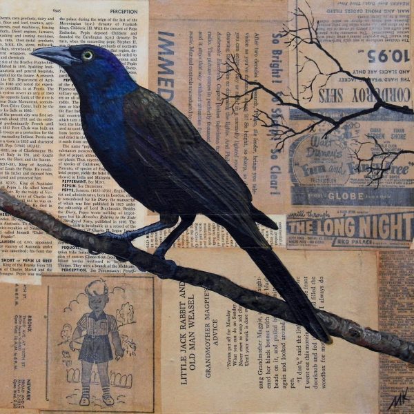 12″ x 12″ x 1″ acrylic painting of the eastern bluebird on collage of vintage maps and book pages.