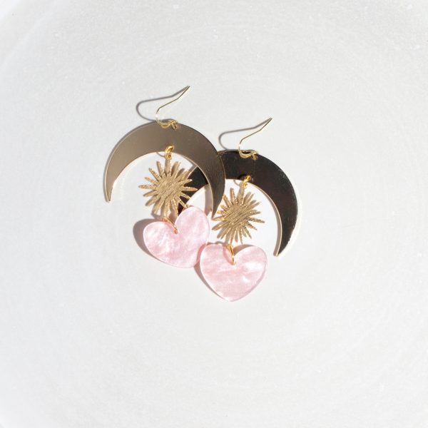 Full Moon features a textured 18k gold plated starburst element and a flat 18k gold plated crescent moon element with a clear cellulose acetate pendant. These earrings are roughly 3.5inches long from the top of the earring wire and roughly 2inches at its widest point. Earring wires are 316 stainless steel with 14k gold plated. Lead, nickel, cadmium free and hypoallergenic.