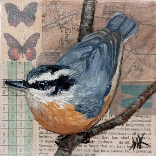 4″ x 4″ x 1″ teeny tiny acrylic painting of purple finch with collage background of found vintage paper on birch plywood panel.