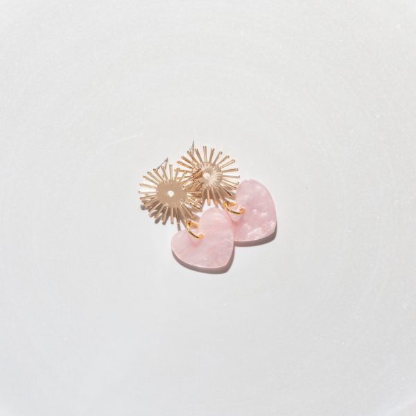 Red Heart Breaker features a clear center element with a bold red, transparent heart and a small 18k gold plated texture sunburst element. Earring wires are 316 stainless steel with 14k gold plated. Lead, nickel, cadmium free and hypoallergenic.