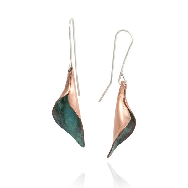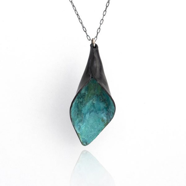 Hand hammered calla lily inspired pendant, patinated slight green on interior. Solid sterling silver, and comes on 18″ sterling silver chain with lobster clasp.