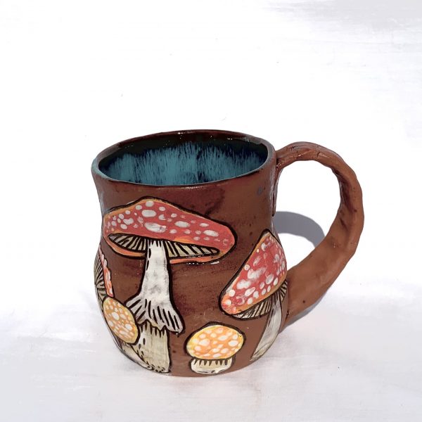 Low fire mug with matte surface with sunflowers. Runny blue glaze interior. Roughly 6×8” made in 2021