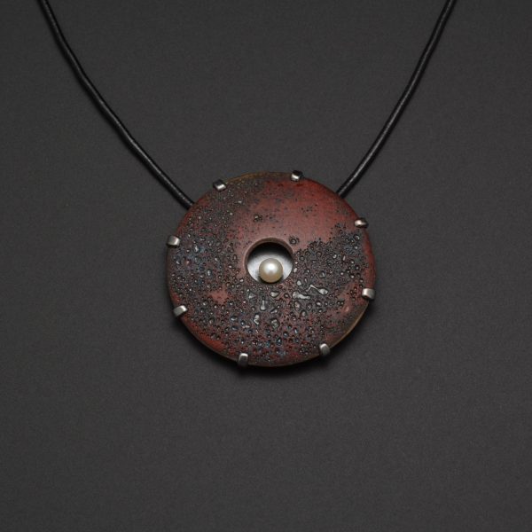A copper disc is formed into a concave shape, enameled and finished to a textured and smoothed stone like surface, then set into another concave disc to form a lentil shaped pendant. Choker comes in 16” unless a longer length is requested.