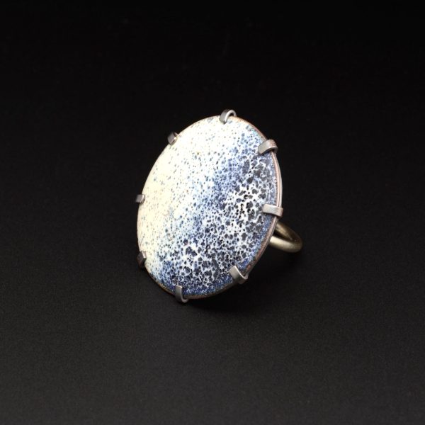 Enamel on copper in a copper setting (1.5” circle x .25” depth), sterling silver ring shank (2.5mm round stock)