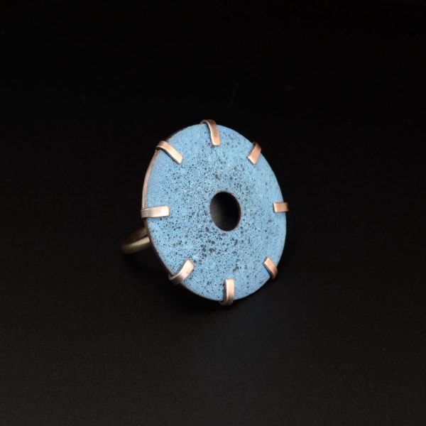 A copper disc is formed into a concave shape, enameled and finished to a textured and smoothed stone like surface, then set into another concave disc to form a lentil shape ring size 8.75.