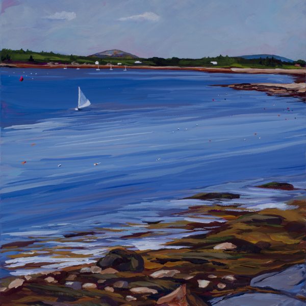 Original Maine seascape painting, acrylic on canvas, painted on location. Painting continues around the edge of gallery wrapped canvas. 5″ x 5″ x 1.5″