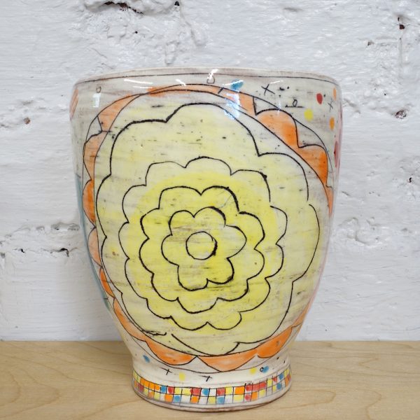 Yunomi Cup , Glaze fired earthenware, 2021, 4.5” tall x 4” wide at the top. This hardy cup is super versatile and feels great in your hand. Great for hot bevies or it can hold an entire can of beer. Holds 13 fluid ounces.